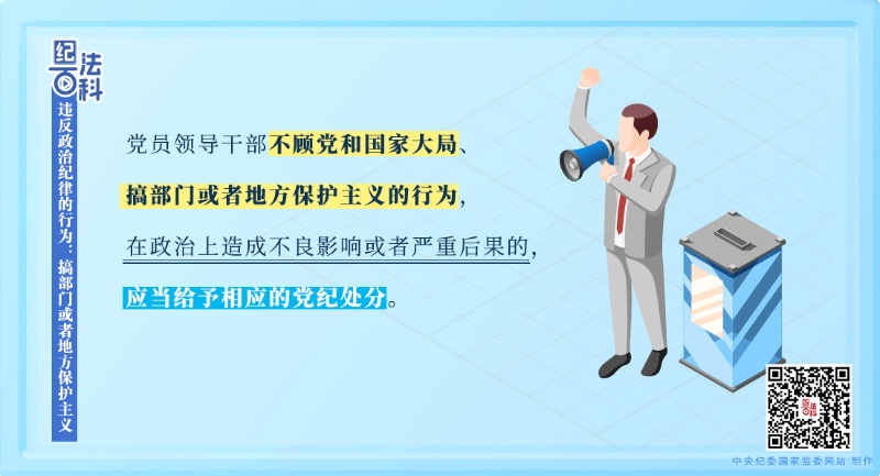 执纪监督中发现,一些地区和部门的党员领导干部不能正确处理全局和局部、中央和地方的关系,存在自行其是,搞本位主义、分散主义的问题。比如,有的各自为政、画地为牢,不关心建设全国统一的大市场、畅通全国大循环,只一门心思建设本地区本区域小市场、搞自己的小循环,或者以“内循环”的名义搞地区封锁;有的出台歧视外资企业和外地企业、实行地区保护的优惠政策,设置歧视性、隐蔽性的区域市场壁垒,等等。对这些不顾党和国家大局、搞部门或者地方保护主义的行为,在政治上造成不良影响或者严重后果的,应当给予相应的党纪处分。