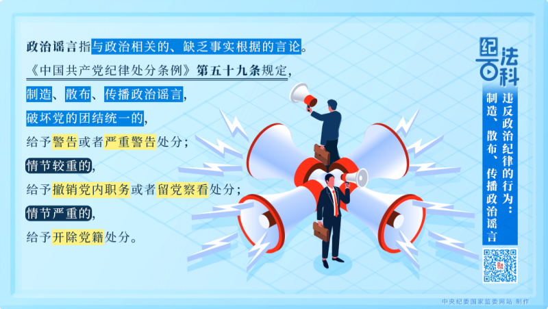 政治谣言指与政治相关的、缺乏事实根据的言论。执纪监督中发现,有的党员、干部为攫取个人利益或博人眼球,打着“听知情人士说”等旗号,制造、散布、传播政治谣言,对所在地区和单位的正常工作造成干扰,对政治生态造成损害,必须以严明的纪律加以约束和震慑。