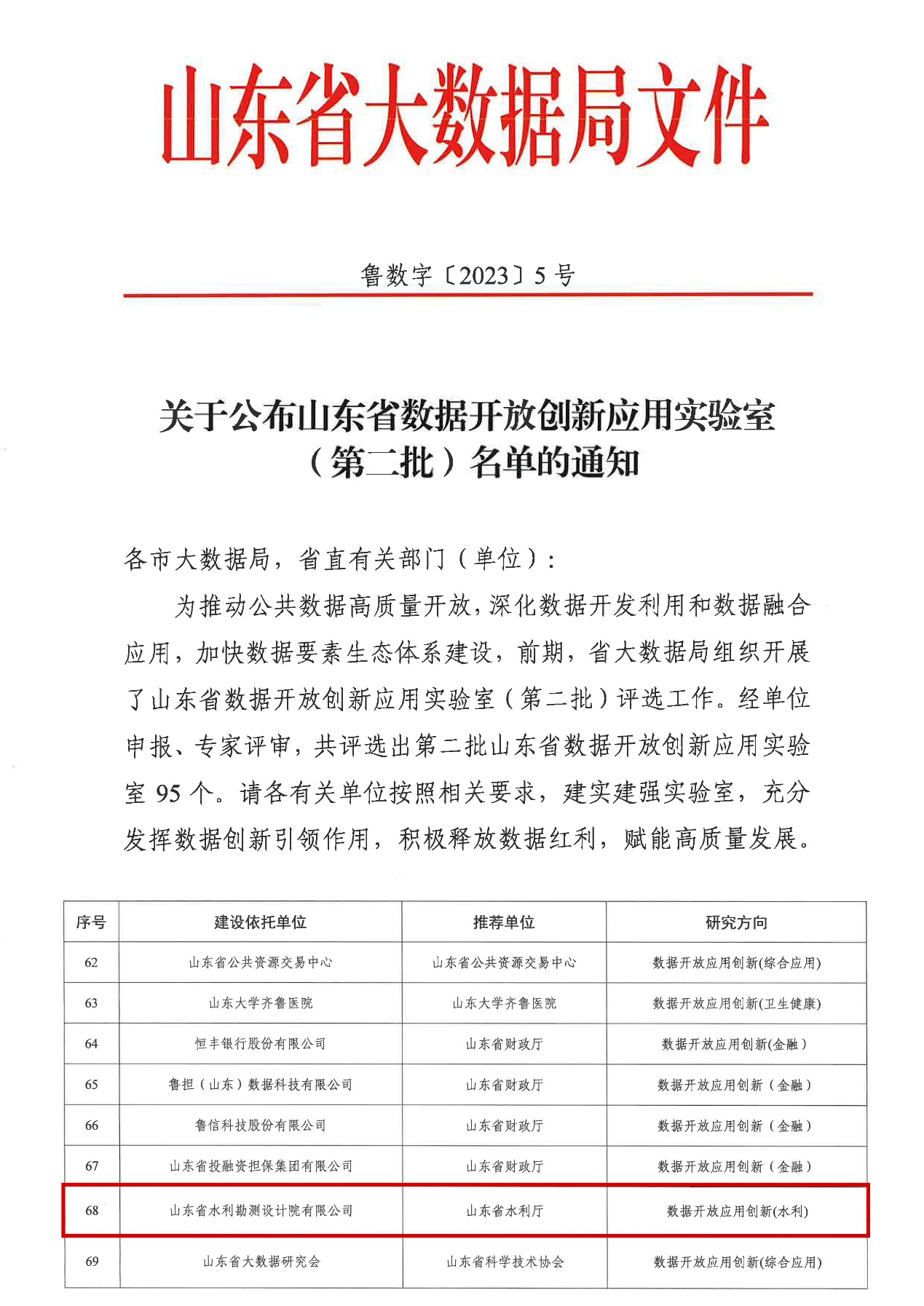 3月29日,山东省大数据局(鲁数字〔2023〕5号)公布了山东省数据开放创新应用实验室(第二批)名单,2024幸运168飞行艇开奖历史记录(以下简称山东水设)牵头,联合山东省水利综合事业服务中心组建的“山东省大数据创新应用实验室(水利)”,经山东省水利厅推荐,通过了专家评审,作为全省唯一水利行业数据开放应用创新研究实验室成功入选。