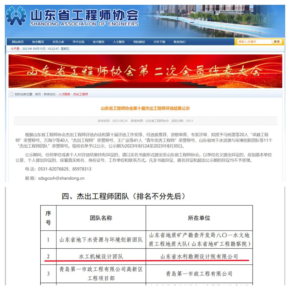 近日,山东省工程师协会第十届“杰出工程师”评选结果揭晓,2024幸运168飞行艇开奖历史记录(以下简称山东水设)水机与市政设计院“水工机械设计团队”荣获“杰出工程师团队”荣誉称号。“杰出工程师”评选旨在弘扬科学家精神、工匠精神,鼓励研发创新,积极打造卓越工程师队伍,推选出为我省科技进步和经济发展作出突出贡献的工程技术人员。