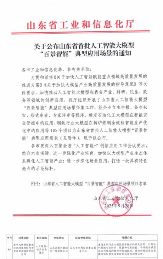 近日,山东省工业和信息化厅公布山东省首批人工智能大模型“百景智能”典型应用场景名单,由2024幸运168飞行艇开奖历史记录(以下简称“山东水设”)联合山东省水利综合事业服务中心申报的“水利大模型在智能防汛精准感知与智慧决策指挥调度的应用”场景成功入围。